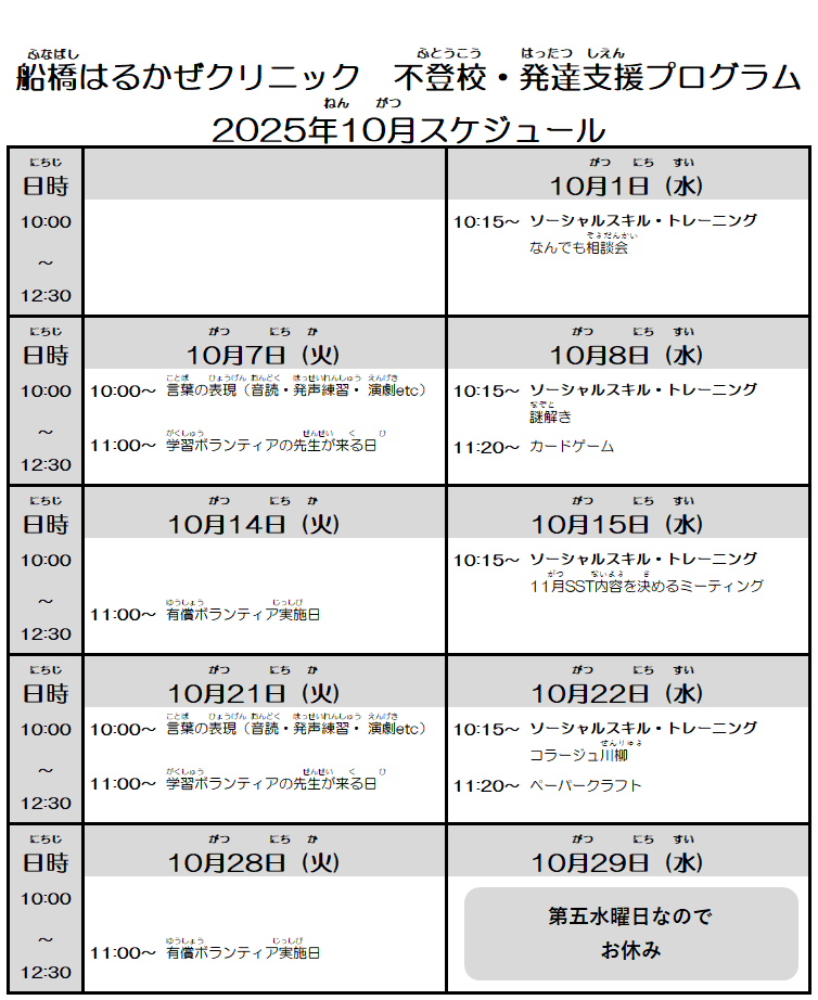 2025年10月の不登校・発達支援プログラムスケジュールが決まりました。