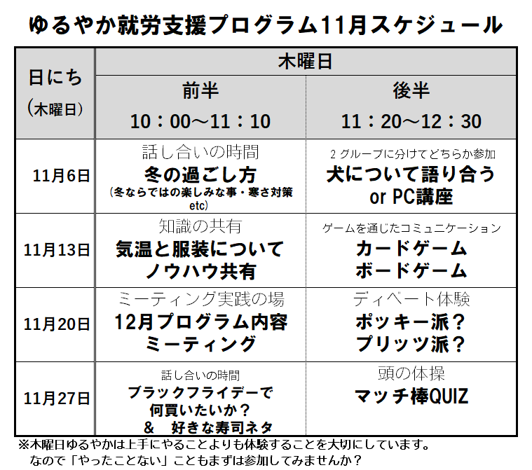 2025年11月1日 / 最終更新日時 : 2025年11月4日 セカンドスペース ゆるやか就労支援 ゆるやか就労支援プログラム2025年11月スケジュール 11月になりました。そろそろ冬の準備をする頃ですね。 11月のゆるやか就労・木曜日プログラムの内容が決まったので告知いたします。 船橋はるかぜクリニック『ゆるやか就労支援プログラム』はプログラム内容を参加者の皆さんと一緒に決めていくのが特徴です。 11月も、先月に続いて話し合いの時間が色々あります。そんな中で、第三週にはちょっと変わった話し合い、『ディベート』があります。当日は実際にポッキーとプリッツも食べてもらうとか?! 皆さんのご参加をお待ちしております!