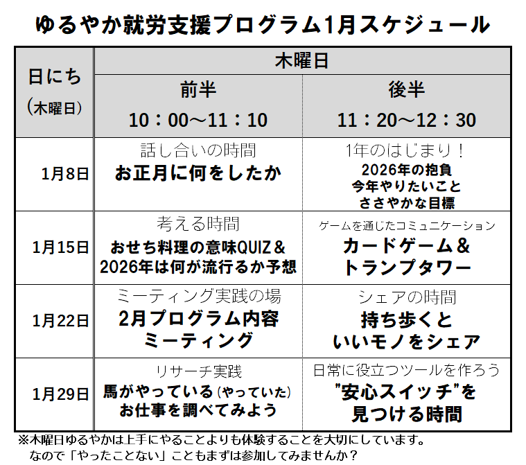 2025年12月28日 / 最終更新日時 : 2025年12月28日 セカンドスペース ゆるやか就労支援 ゆるやか就労支援プログラム2026年1月スケジュール そろそろ新年、2026年の始まりです! 1月のゆるやか就労・木曜日プログラムの内容が決まったので告知いたします。 船橋はるかぜクリニック『ゆるやか就労支援プログラム』はプログラム内容を参加者の皆さんと一緒に決めていくのが特徴です。 2026年第一週は新年らしくお正月や抱負についてです。それ以外の週も1月らしい内容が続きますね。 皆さんのご参加をお待ちしております!