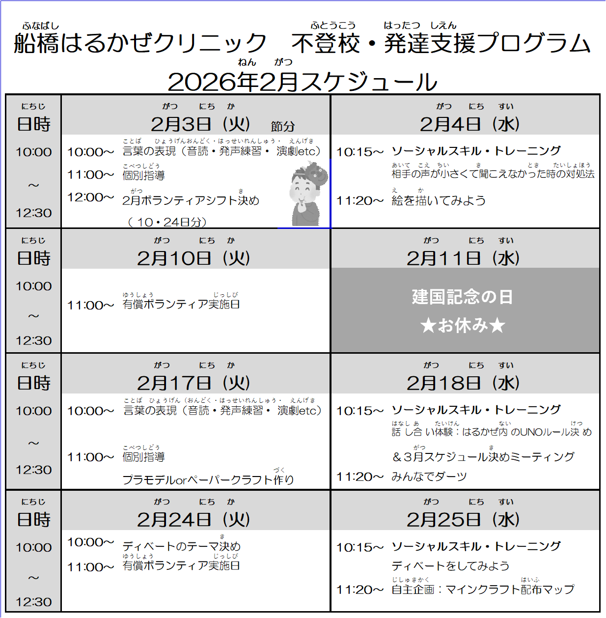 2026年2月の不登校・発達支援プログラム・スケジュールが決まったのでお知らせします。
